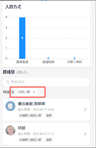 *筛选:入群方式、是否在群、新老会员、是否粉丝