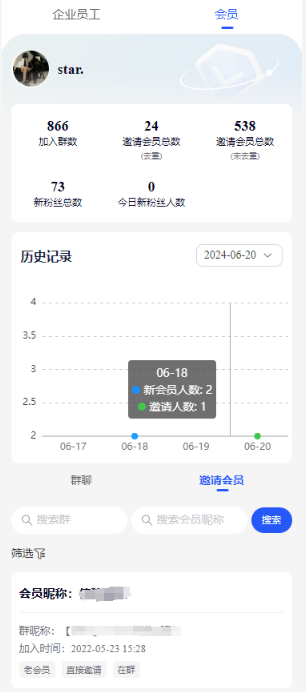 3)邀请人会员,只有通过群拓客二维码邀请的,才能获取到邀请会员,直接拉人进群是没有的.