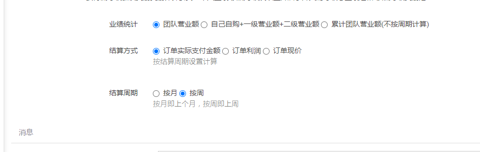 5) 业绩统计:团队营业额;自购+一级+二级营业额(已完成订单)+累计团队营业额(不按周期计算)
