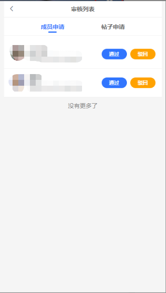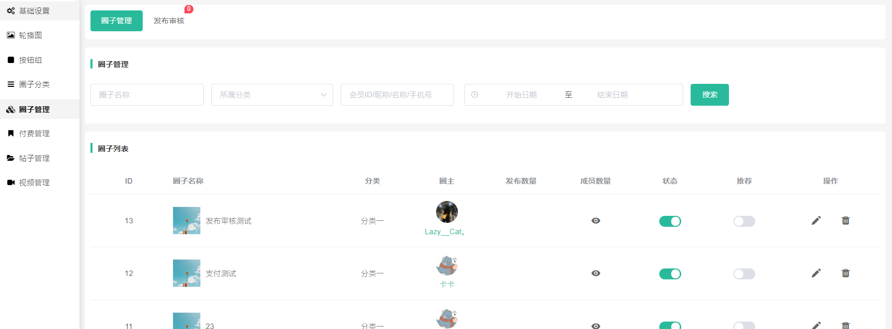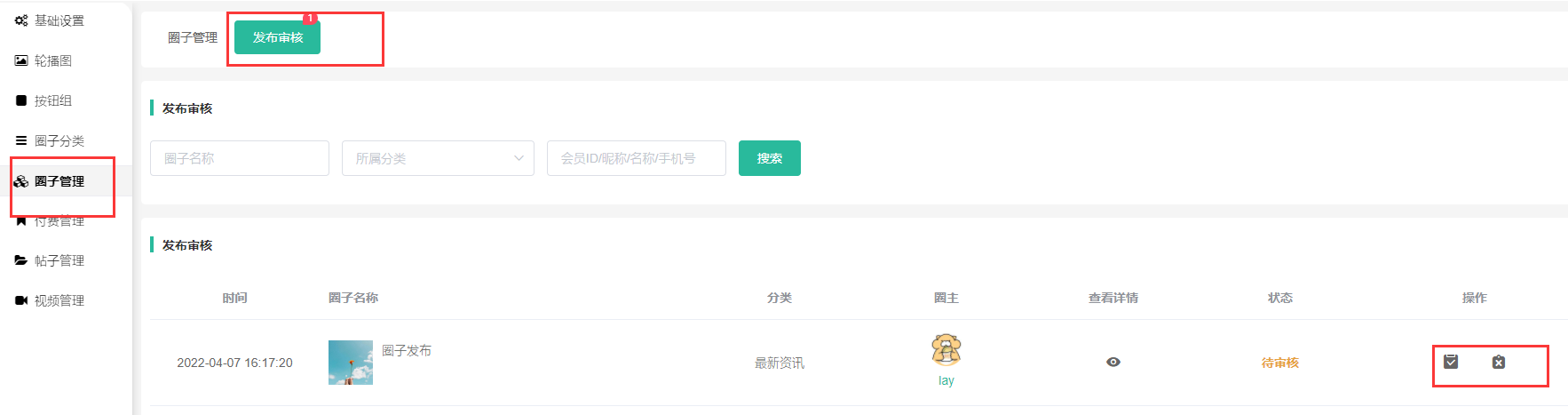 ①.开启需要审核,会员前端进行创建圈子时候,在后台进行审核通过/驳回