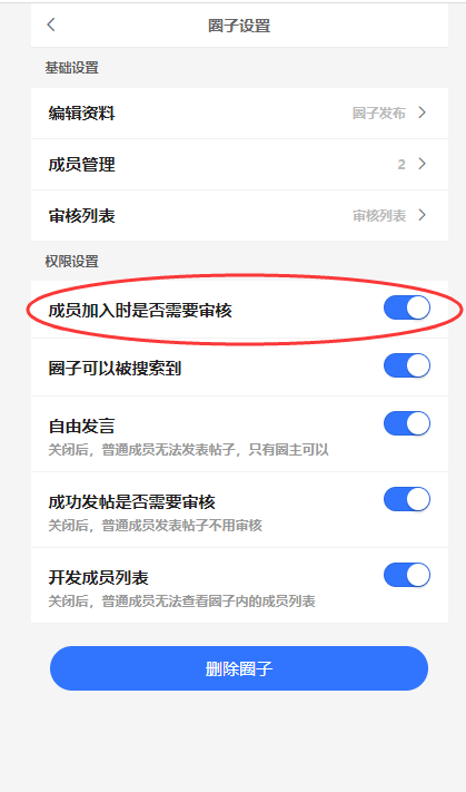 ②.会员发布圈子成功后,其他会员进入该圈子,圈主可以设置是否需要审核,前端流程如下