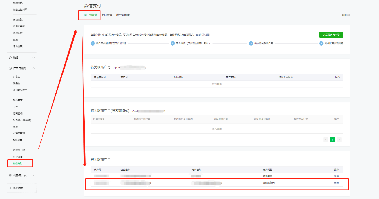 3、注意:微信支付的子商户(即门店的进账商户号)必须是通过服务商账号添加申请的,不能去关联其他服务商的子商户或者其他已开通好的子商户。