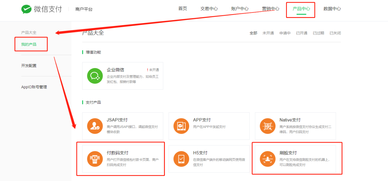 (2)公众号支付微信商户号、服务商绑定的特约子商户都要开通扫码付(当面付、付款码支付),刷脸支付、JSAPI支付(最基本的支付产品权限)、native支付.