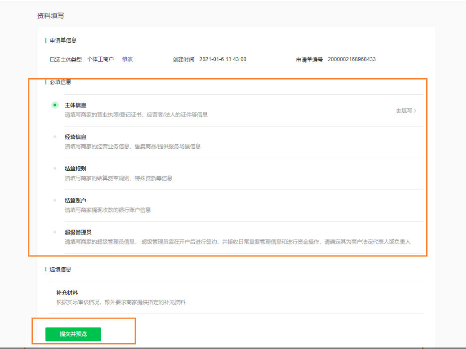 (二)服务商添加特约子商户(即门店独立后台子商户),按照提示要求填写资料,申请子商户,支持个体户申请。