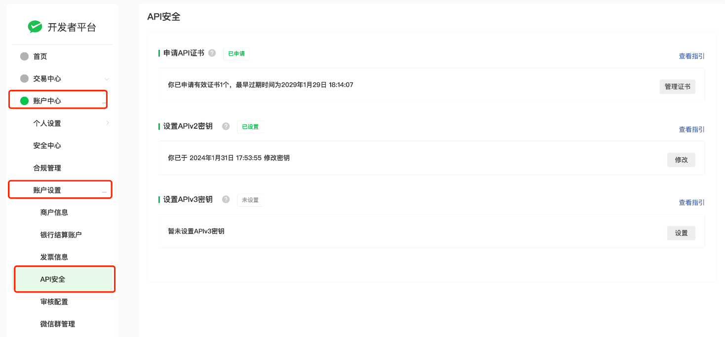 服务商商户号配置好APIV2密钥(即支付密钥,必须32位数)和申请好API证书。