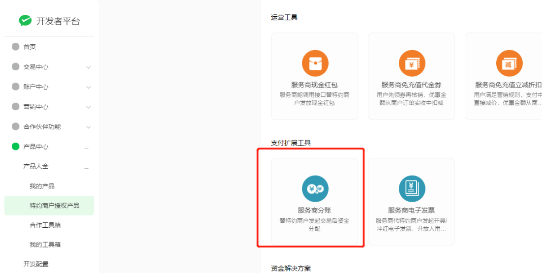 等特约子商户申请下来后,下一步请登录子商户后台pay.weixin.qq.com,并在产品中心--我授权的产品--选择关联的服务商,授权服务商分账功能。