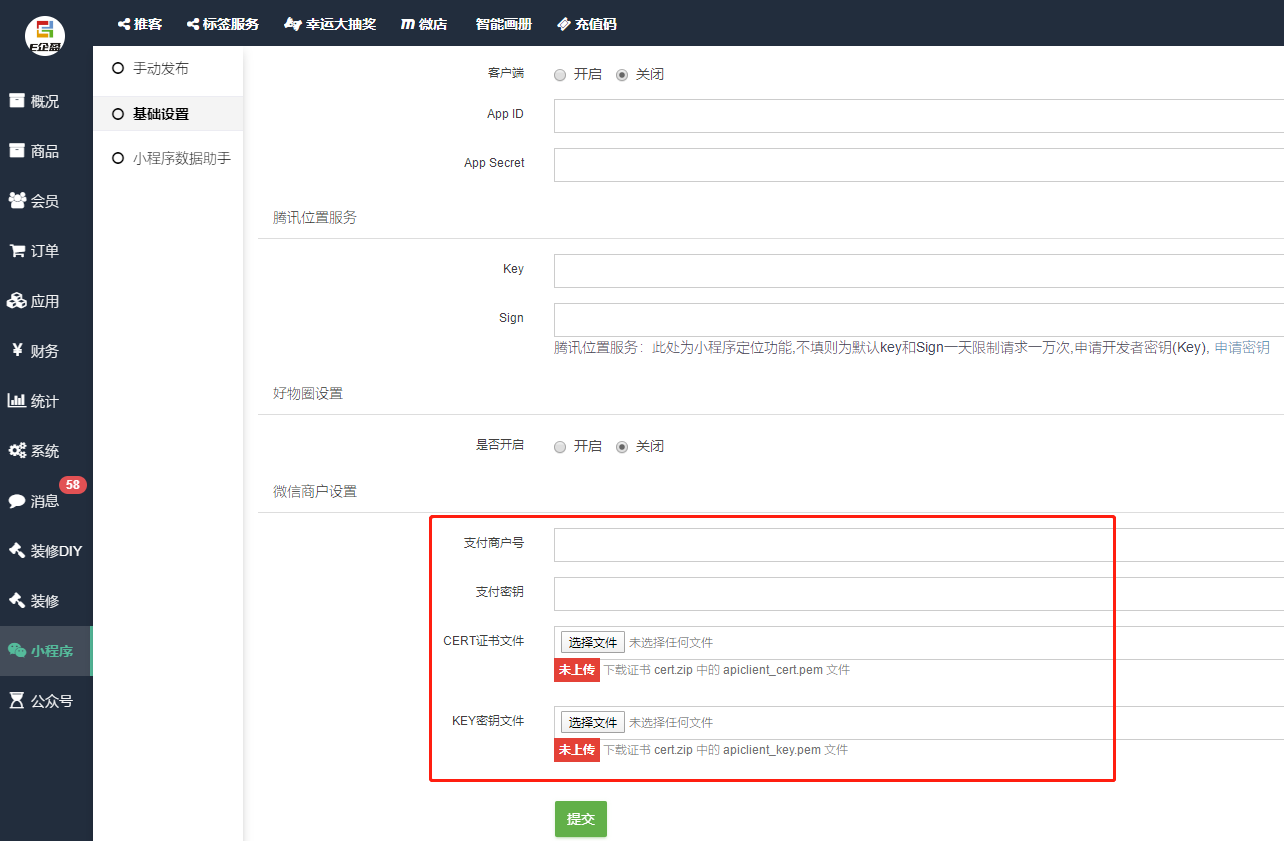 第五步;把获取的微信支付商户号-密钥-商户证书,上传到商城的后台。