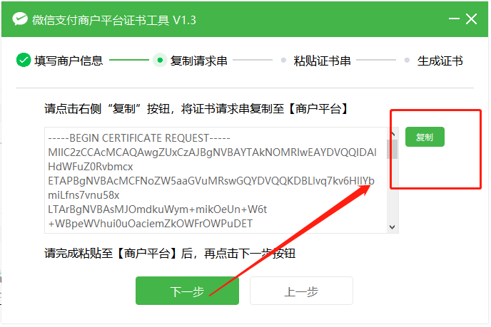 证书串已生成!请点击按钮“复制证书串”,并粘贴到【证书工具】中获取证书文件完成粘贴后点击下一步,即可生成证书文件和私钥文件