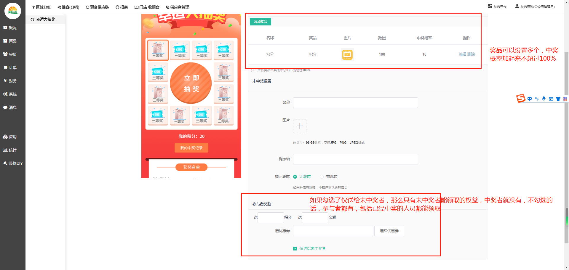 参与者奖励:优惠券、积分、爱心值、余额(中奖概率不能超过或者等于100%)