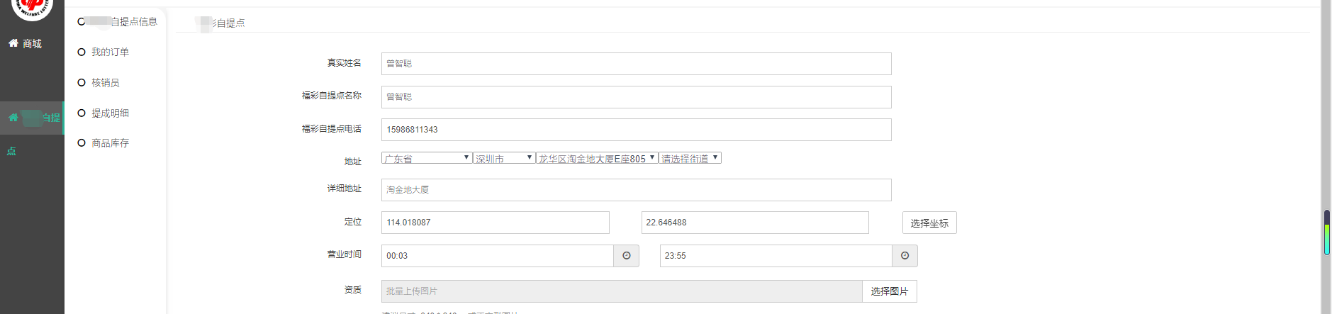 自提点信息-我的订单-核销员-提成明细-商品库存