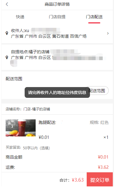 1. 进入开启了跑腿配送的门店,下单商品选择门店配送(虚拟商品除外),同时兼容门店配送规则插件的限制。如果开启了第三方运费,则走码科后台运费。