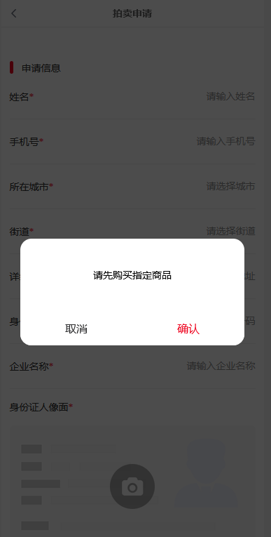 拍卖官申请入口,点击进入拍卖官申请页面,如未购买指定商品,会跳转到指定商品详情页,并提示“请先购买指定商品”,购买完成后再次进入拍卖官申请页,填写信息提交申请;